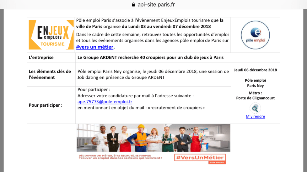 Pôle Emploi organise une journée de recrutement afin de trouver des croupiers pour l’établissement en présence des futurs dirigeants du club le 6 décembre prochain ! Toutes les infos, juste en dessous !