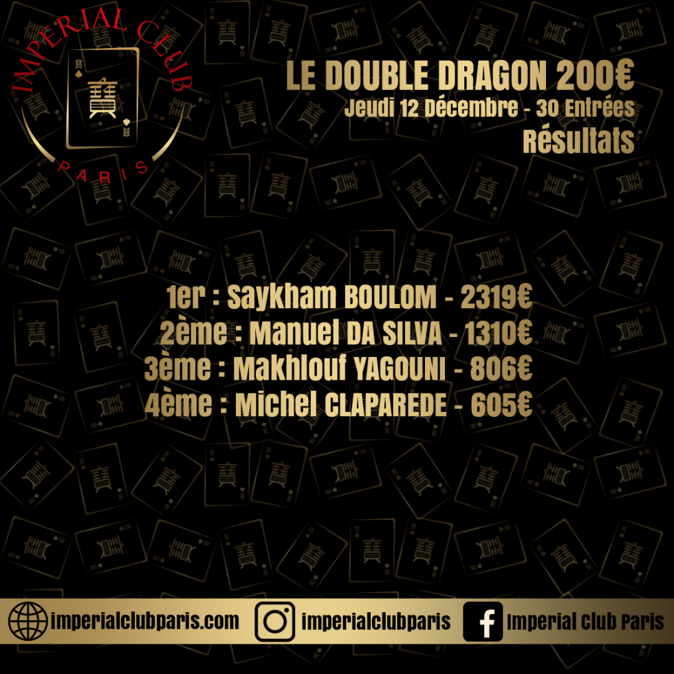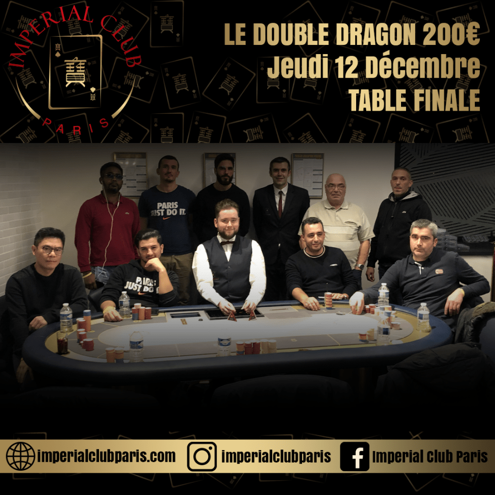L’Imperial Club Paris organisait, hier soir, la première édition de son tournoi « Double Dragon » au Buy-in de 200€. 30 entrants ont été comptabilisés sur cet événement. Un chiffre moindre que le premier tournoi, certainement en raison des grèves qui perturbent les transports en ce moment dans la capitale.