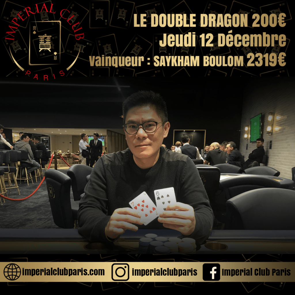 L’Imperial Club Paris organisait, hier soir, la première édition de son tournoi « Double Dragon » au Buy-in de 200€. 30 entrants ont été comptabilisés sur cet événement. Un chiffre moindre que le premier tournoi, certainement en raison des grèves qui perturbent les transports en ce moment dans la capitale.