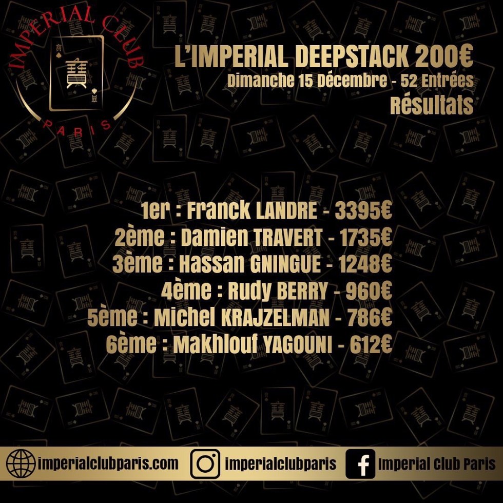 Dimanche dernier, l’Imperial Club Paris organisait la deuxième édition de l’Imperial Deepstack. Un tournoi à 200€ avec une structure assez profonde. 52 entrants ont été comptabilisés sur cet événement sur lequel 6 joueurs sont entrés dans l’argent.