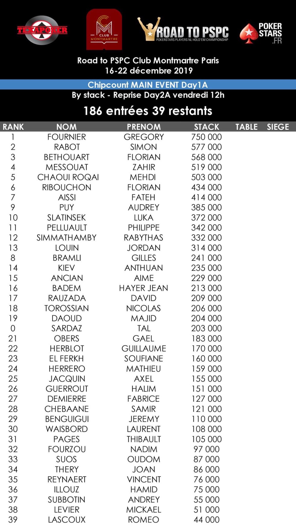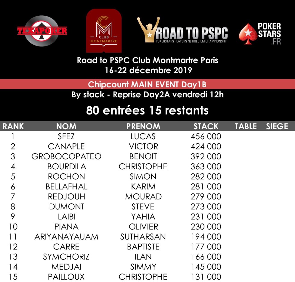 Le Day 1A du Main Event a rassemblé 186 joueurs (39 survivants), le Day 1B, 80 entrants (15 restants) et le Day C, 218 inscrits. Vous pouvez suivre un coverage signé Veunstyle sur Club Poker. Le Community Manager du Club vous fait aussi vivre le festival de l’intérieur grâce à ses stories sur le compte Instagram de l’établissement. Quelques visages familiers ont disputé ce tournoi comme l’ambassadeur de PokerStars Kalidou Sow, Roger Hairabedian, Steven Moreau, Florence Allera, Florian Ribouchon ou Pierre Merlin.