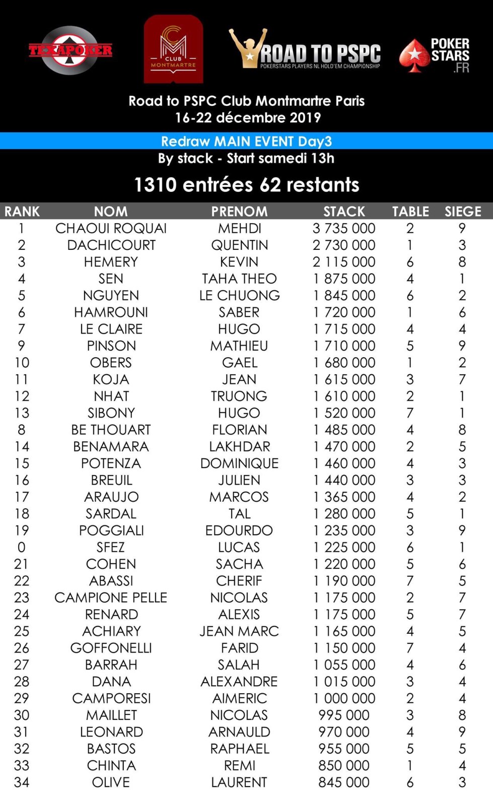Le Road to PSPC Paris by PokerStars et TexaPoker bat son plein au Club Montmartre. 62 joueurs se sont qualifiés pour le Day 3 du Main Event qui va débuter, ce samedi, à 13h. Ils étaient 1.310 entrants sur la ligne de départ. Mehdi Chaoui débutera la journée, en position de chipleader. A noter, la présence de Jean Koja, membre des Entrams. Le reg Tal Sardal est aussi là, tout comme le jeune Lucas Sfez. Simon Roboh, récent vainqueur du DSO Paris jouera aussi ce Day 3. L’objectif de cette journée sera de parvenir à 9 joueurs restants, soit la pré table finale. Le streaming commencera lorsque les 8 derniers joueurs seront connus.