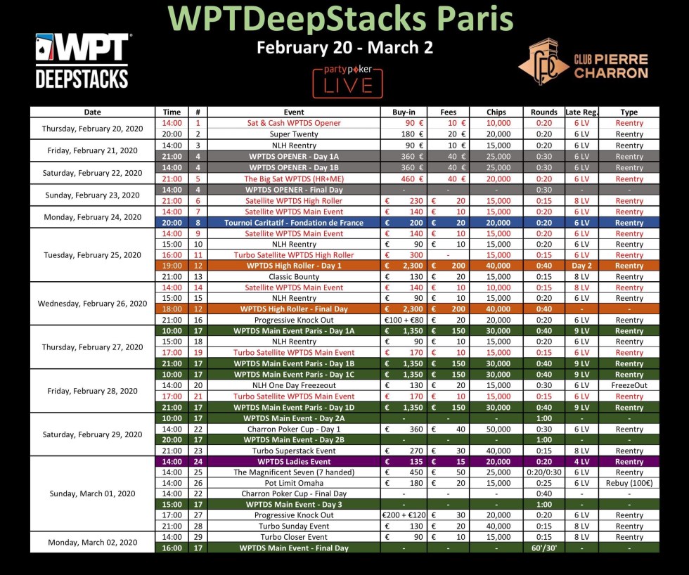Le Club Pierre Charron va accueillir le WPT Deepstacks Paris du 20 février au 2 mars 2020. De beaux tournois seront organisés durant les dix jours de ce festival.