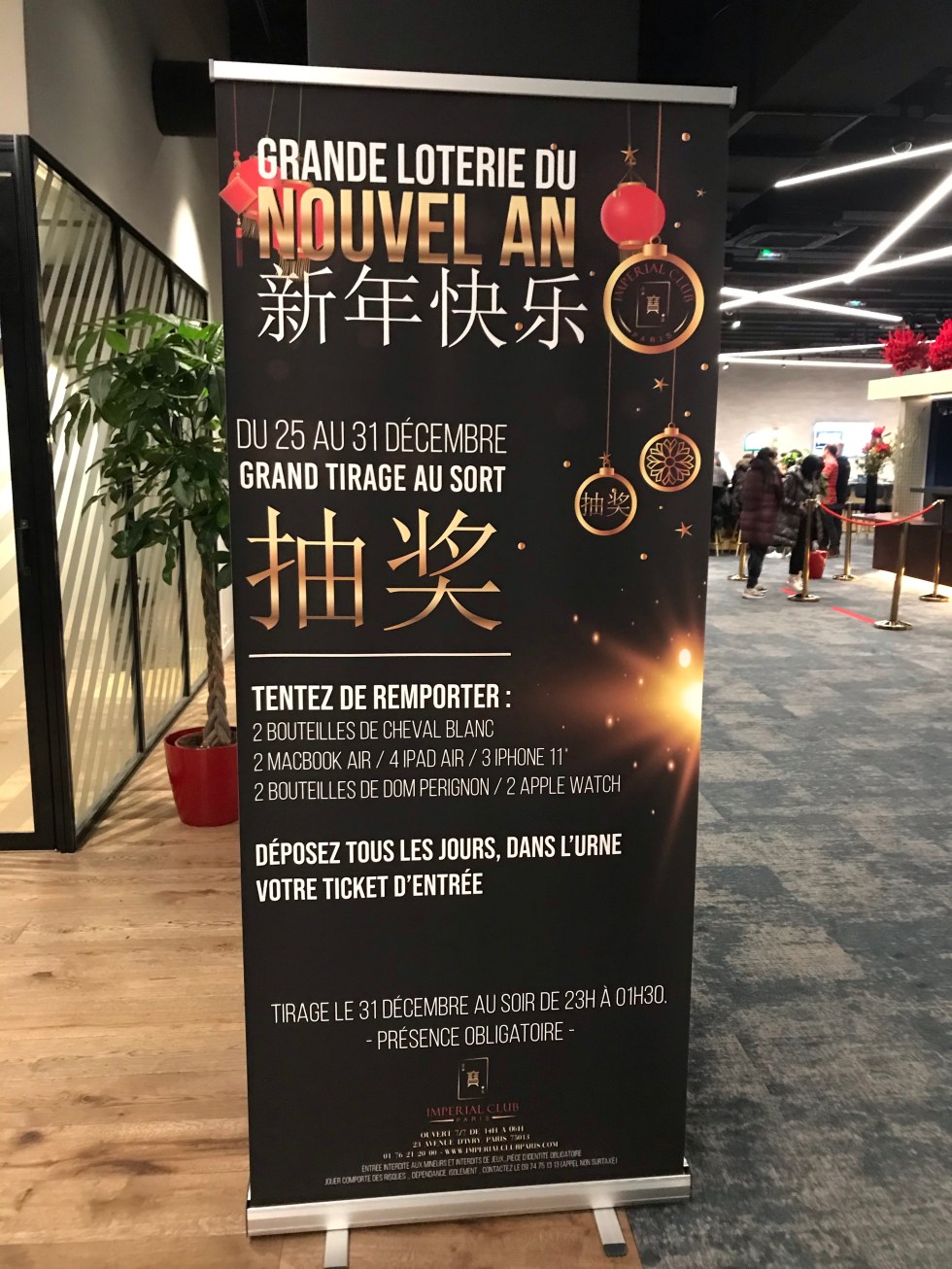 Des lots de belle facture seront mis en jeux pour ce tirage : 2 bouteilles de Cheval Blanc, 2 Mac Book Air, 4 iPad Air, 3 iPhone 11, 2 bouteilles de Dom Perignon, 2 Apple Watch. La présence est obligatoire le soir du tirage au sort pour remporter les lots.