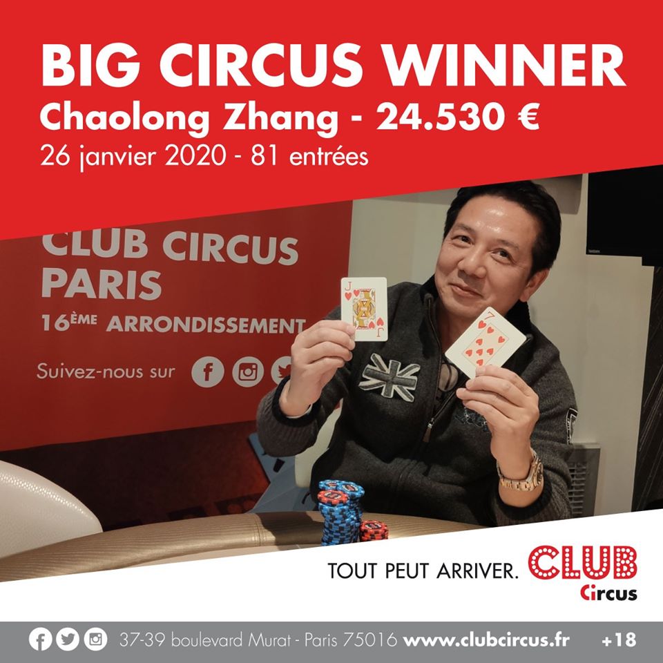 Au Club Circus Paris, 81 entrants ont participé au Big Circus. C’est Zhang Chaolong qui a tiré son épingle du jeu et empoche 24.530€.