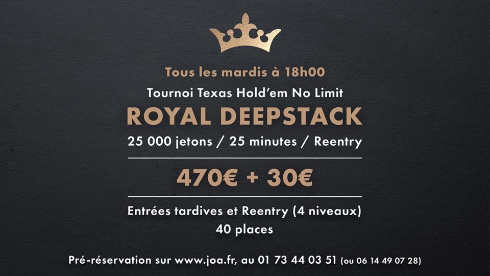 – Chaque mardi à 18h, le Royal Deepstack. Il s’agit d’un un tournoi Freezout (470€+30€). Les joueurs disposeront de 25.000 jetons et s’affronteront sur des niveaux de 25 minutes. La première édition aura lieu le 11 février.