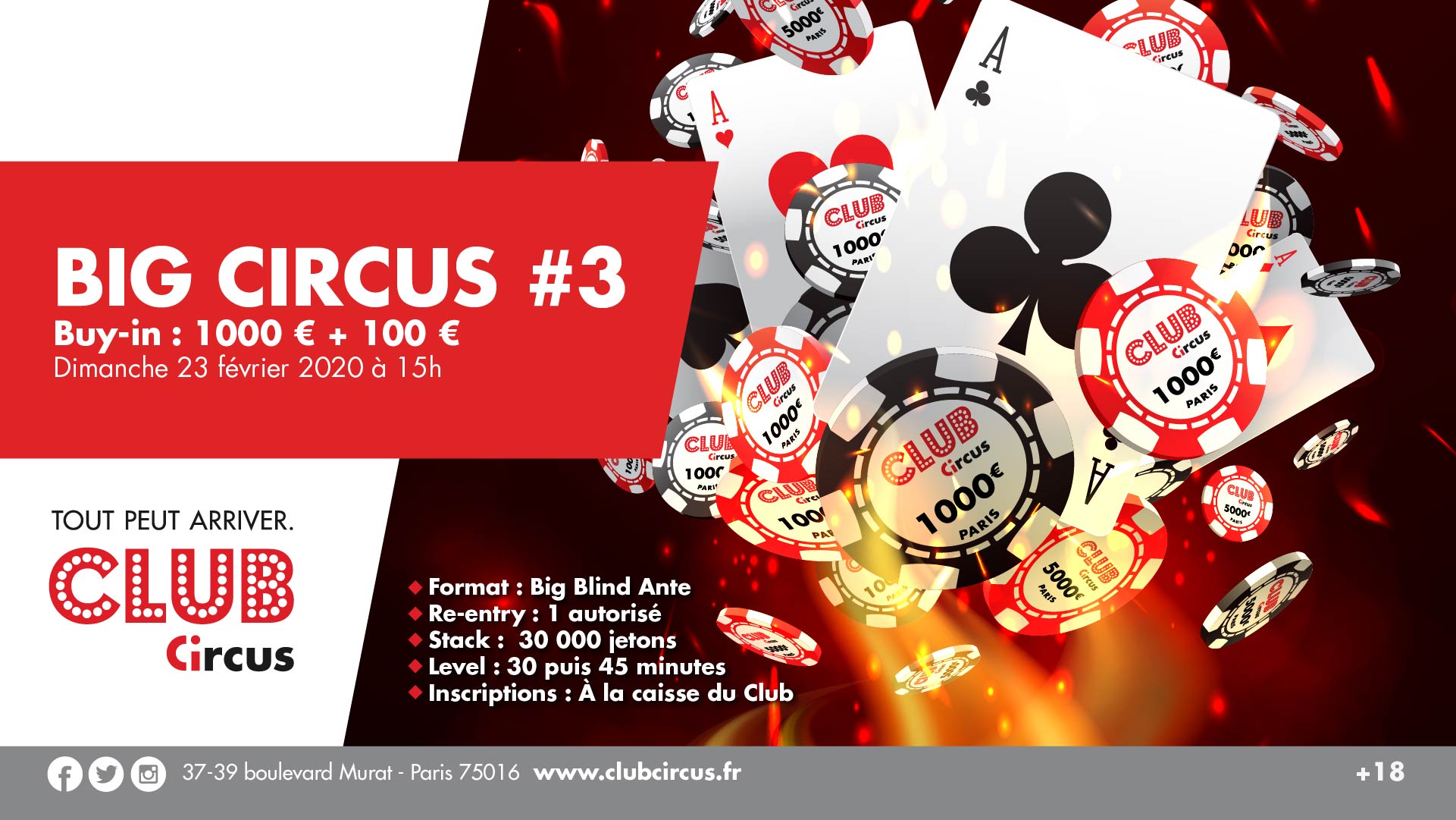 Le Club Circus paris est devenu une place forte du poker à Paris avec ses tournois réguliers comme l’Open Circus qui attire le gratin des joueurs parisiens. Le dimanche 23 février à 15h, le club du Boulevard Murat va organiser pour la troisième édition du BIG CIRCUS avec un Buy-in à 1.100€ ( 1.000€ + 100€) avec un format Big Blind Ante et un Re-entry autorisé. La première édition avait été remportée par Kamel Atoui pour la bagatelle de 42.000€. 162 entrants avaient été comptabilisés sur ce tournoi événement. La seconde édition avait rassemblé 81 joueurs et c’est Zhang Chaolong qui avait tiré son épingle du jeu.