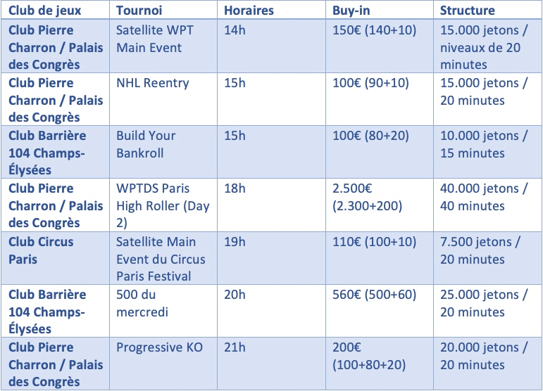 A Paris, l’offre de tournois s’accroît au fil des semaines. Ce mercredi, sept tournois sont organisés dans trois clubs différents de la capitale. Il y en a pour toutes les bourses de 100 à 2.500€. Petit tour d’horizon des tournois de poker organisés dans la capitale ce mercredi 26 février.