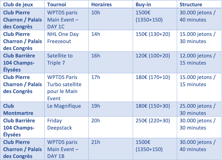 Le Club Barrière 104 Champs-Elysées propose de son côté un satellite pour le tournoi 777 et en soirée le Friday Deepstack à 250€.