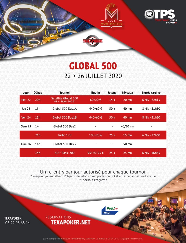 Du 22 au 26 juillet, les fans de tournoi se donneront rendez-vous au Club Montmartre pour disputer le Global 500. Deux journées de départ sont prévues sur le Main Event (1A le jeudi 23 juillet à 15h, 1B le vendredi 24 juillet à 15h). Il faudra débourser 500€ (440+60) pour participer à cet événement.