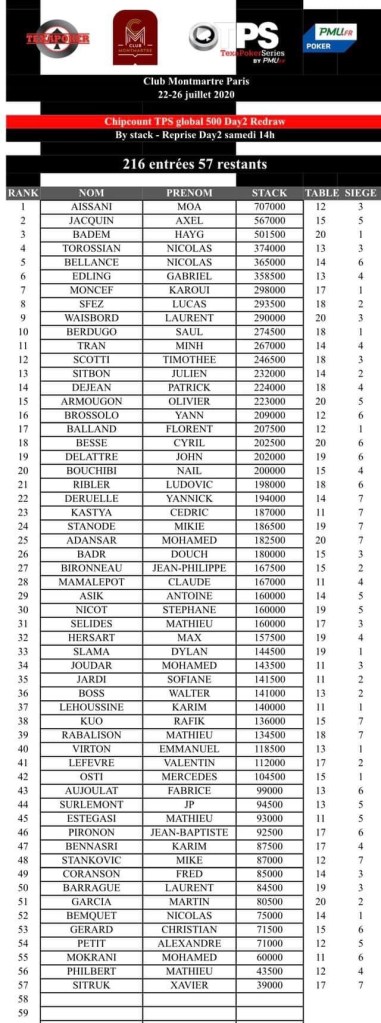 Le Day 2 débutera samedi à 14h avec 57 survivants. Découvrez ci-dessous le Chipcount du Day 1B et de l’ensemble du Day 1 (A+B).