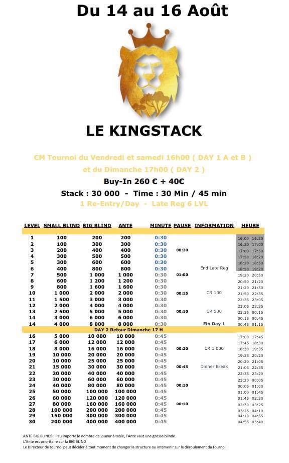 Le Club Montmartre organise la seconde édition de son KingStack 300. Il se déroulera du vendredi 14 au dimanche 16 août avec un Buy-in fixé à 300€ (260+40). Il comporte deux Days 1 (vendredi 16h00 et samedi 16h00), ainsi qu’un Day 2 qui débute le dimanche à 17h.