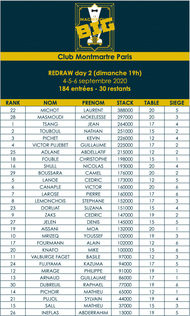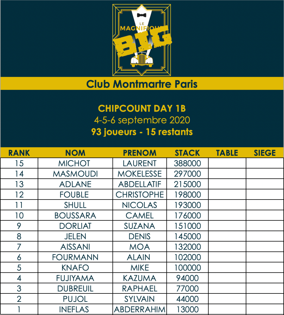 Pour le Day 1B de ce tournoi au Club Montmartre, l’affluence était, à nouveau, au rendez-vous.93 entrants ont été comptabilisés, avec les 91 joueurs de la veille, le total des participants s’élève à 184 entrants. Le vainqueur du tournoi empochera donc un joli chèque.