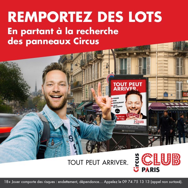 Le Club Circus a décidé de déployer une campagne d’affichage dans les rues de Paris visant à toucher un public large. Plus de 250 panneaux afficheront les visuels du club du Boulevard Murat. Un jeu concours est même organisé dont le but est de faire un selfie devant le panneau et de partager le cliché sur les réseaux sociaux. Les personnes qui jouent le jeu en partageant en story la photo en mentionnant le Club Circus peuvent profiter de 20€ de jetons non négociables.