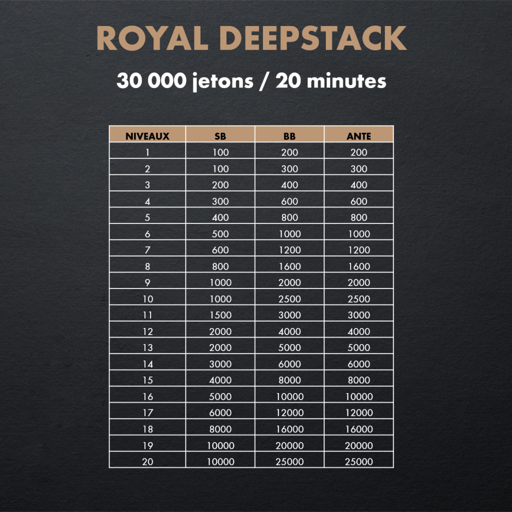 - 30 000 jetons de départs, niveaux de 20 minutes
