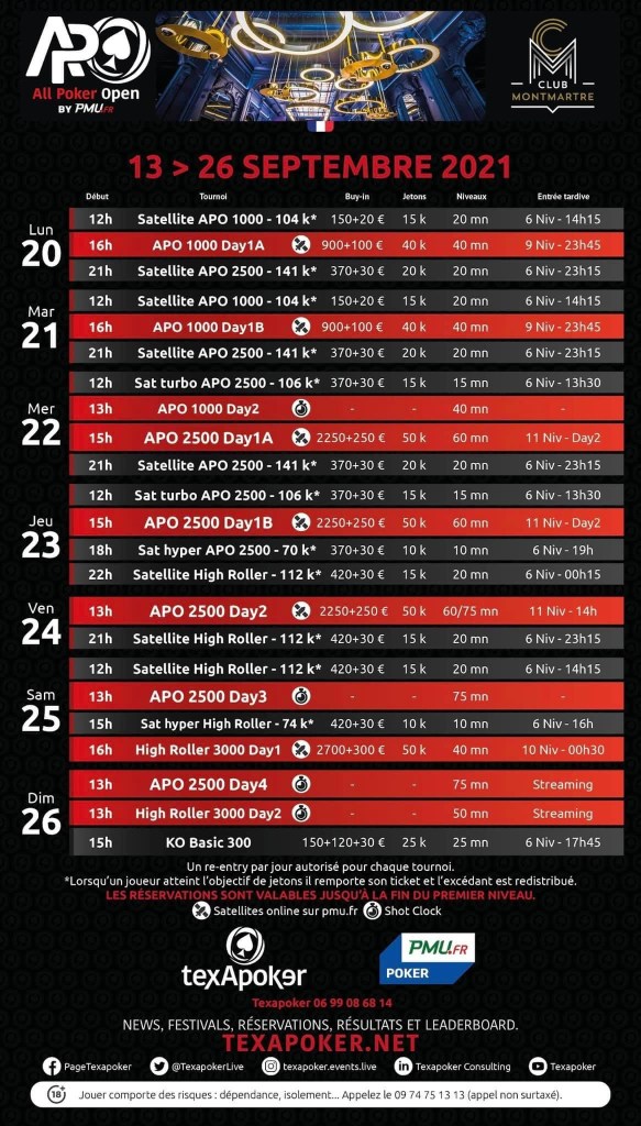 Le festival All Poker Open 2500 by PMU.fr fait son grand retour avec un Main Event au buy-in de 2.500 euros. Les Jours 1A et 1B se tiendront les mercredi 22 et jeudi 23 septembre ensuite un Jour 2 le vendredi 24 septembre. Le Jour 3 aura lieu le samedi 25 septembre.