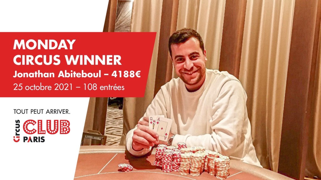Le doublé pour Jonathan Abiteboul ! Après une victoire au début du mois d’octobre, il remporte à nouveau le Monday Circus. 108 entrants ont été comptabilisés sur ce tournoi à 170€ de Buy-in.