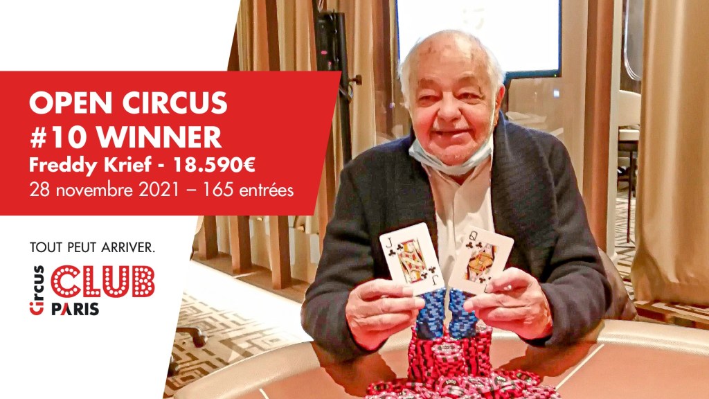 Dimanche dernier, le Club Circus Paris organisait la 10e édition de l’Open Circus, un tournoi à 500 euros de Buy-in (450+50). 165 entrants ont été recensés sur cet événement (Prizepool 71.280€). C’est Freddy Krief qui a tiré son épingle du jeu et empoche 18.590€. Charles Assous prend la deuxième place et Benjamin Dahan complète le podium.