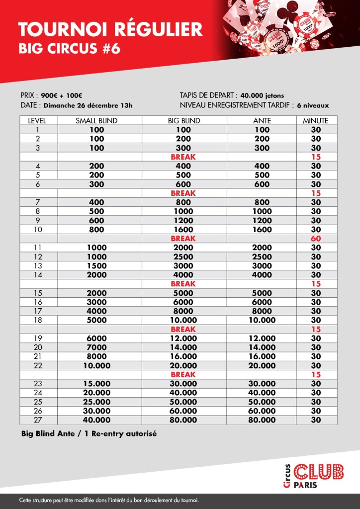 Sur ce Big Circus, les joueurs partiront avec un stack de 40.000 jetons à faire fructifier sur des niveaux de 30 puis 45 minutes. Une structure assez deep qui permettra de pratiquer un beau poker. A noter que la table finale sera streamée.