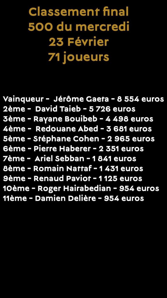Comme tous les mercredis, le Club Barriere organisait son tournoi hebdomadaire à 560€. Au total, 71 joueurs ont pris part à l’événement. C’est Jérôme Gaeta qui s’est imposé pour 8.554€. David Taieb, runner-up, repart avec 5.726€ et Rayane Bouibeb complète le podium (4.498€). Roger Hairabedian parvient à accrocher l’une des places payées.