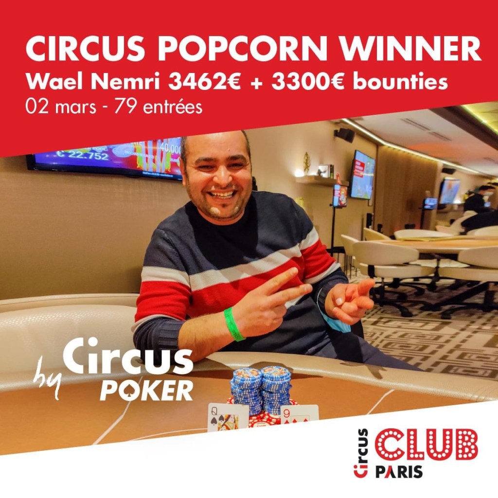 Hier soir, le Club Circus Paris organisait son traditionnel tournoi KO progressif : le PopCorn. 79 entrants ont été recensés sur cet événement à 330€ de Buy-in. C’est Wael Nemri qui s’est imposé !