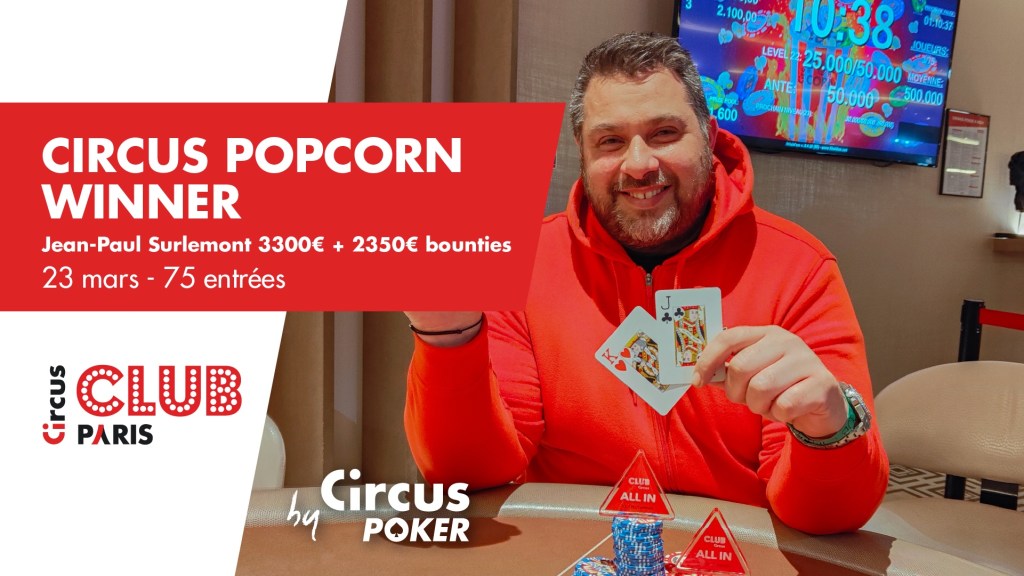 Belle affluence, mercredi soir, sur le PopCorn à 330€ de Buy-in, 75 entrants étaient en lice. C’est Jean-Paul Surlemont qui s’est imposé pour 5550€ au total. Olivier Dahan est le runner-up de ce tournoi KO progressif. Jonathan Abiteboul complète le podium. Ce week-end, un très bel événement est prévu avec le Big Circus.