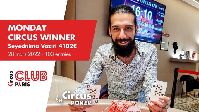 Une fois de plus, le Monday Circus à 170€ de Buy-in a fait le plein. 103 entrants ont été recensés. C’est Seyednima Vaziri qui est parvenu a dominé ce field. Il empoche 4.102€ pour ce succès. Michael Erbil, le runner-up, repart avec 2.800€. Mathieu Bonnet complète le podium (1.900€). 13 joueurs sont entrés dans l’argent dont Meddi Ferrah.