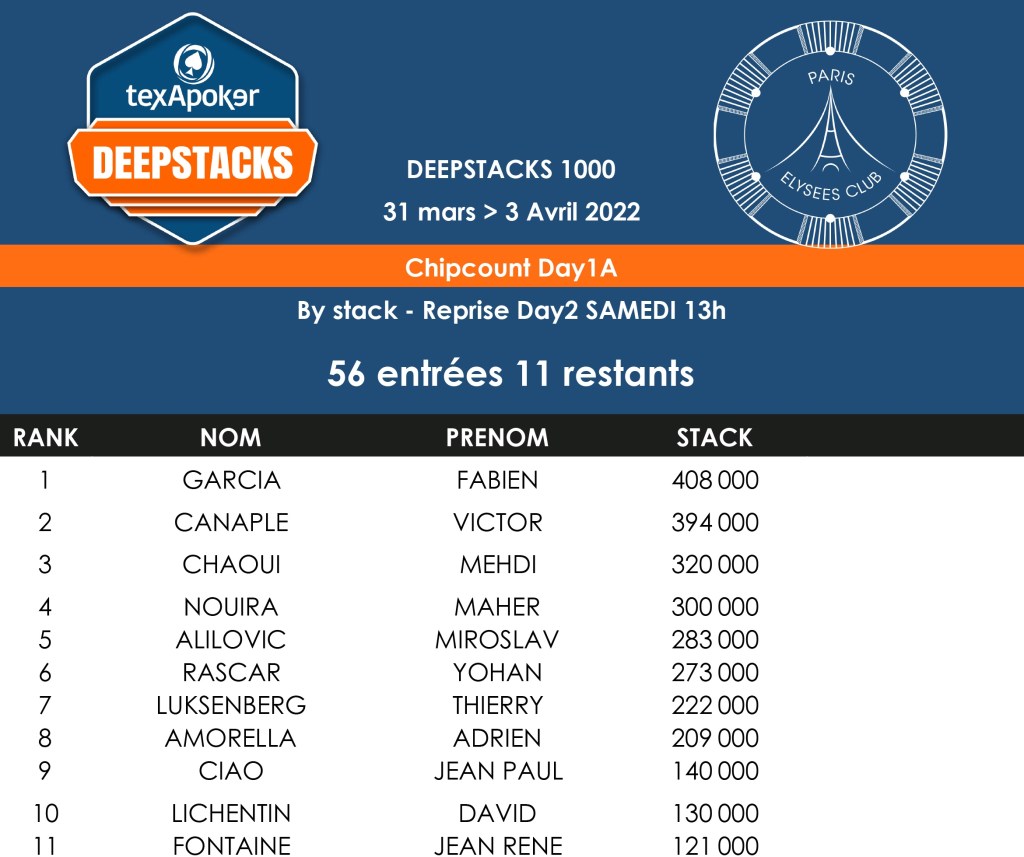 Sur le Day 1 A du Deepstacks à 1.000€ de Buy-in, 56 entrants ont été comptabilisés. Les participants disposaient de 50.000 jetons à faire fructifier sur des niveaux de 40 minutes. 11 joueurs se sont qualifiés pour le Day 2. À l’issue de cette journée de départ, c’est Fabien Garcia qui a empaqueté le plus de jetons.