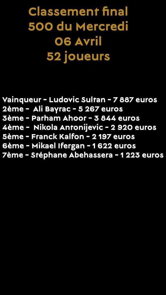 C’est Ludovic Sultan qui s’est adjugé ce tournoi pour 7.887€. Le joueur affiche un joli palmarès. Sa plus belle performance est une victoire, en 2012, sur le FPS Deauville. Ali Bayrac, 2ème, empoche 5.267€. Parham Ahoor complete le podium.