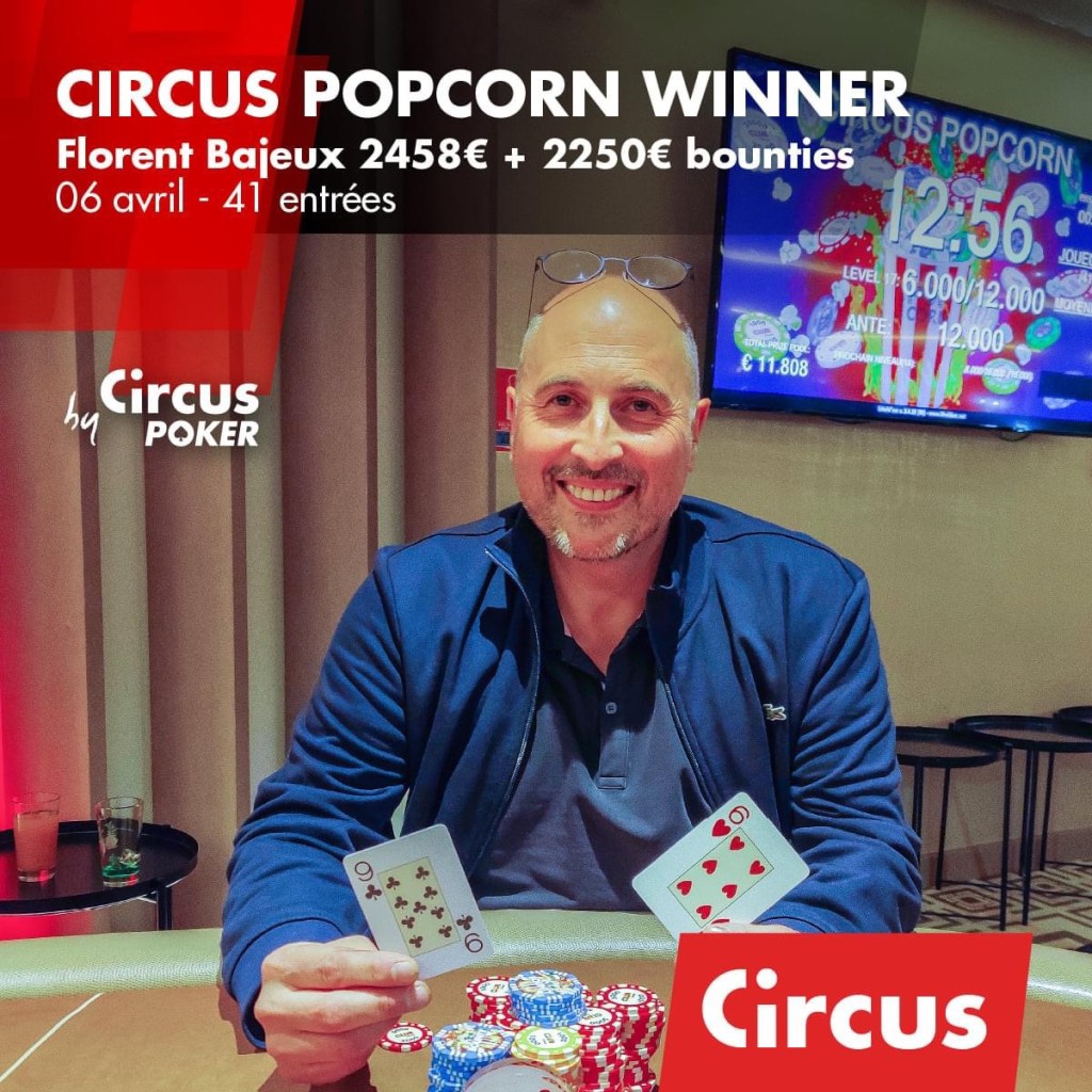 Comme tous les mercredis, le Club Circus organisait son tournoi PopCorn, un format KO progressif qui assure beaucoup d’action à la table. 41 entrants ont été comptabilisés sur le tournoi du 6 avril à 330€ de Buy-in.