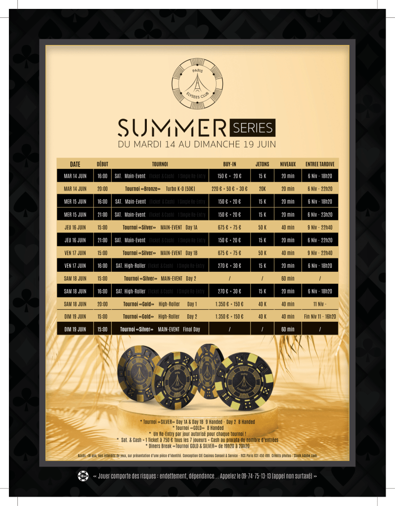 – Un tournoi Gold à 1.500€, High Roller, du 18 au 19 juin. Sur ce tournoi, les joueurs partiront avec 40.000 jetons, sur des niveaux de 40 minutes.