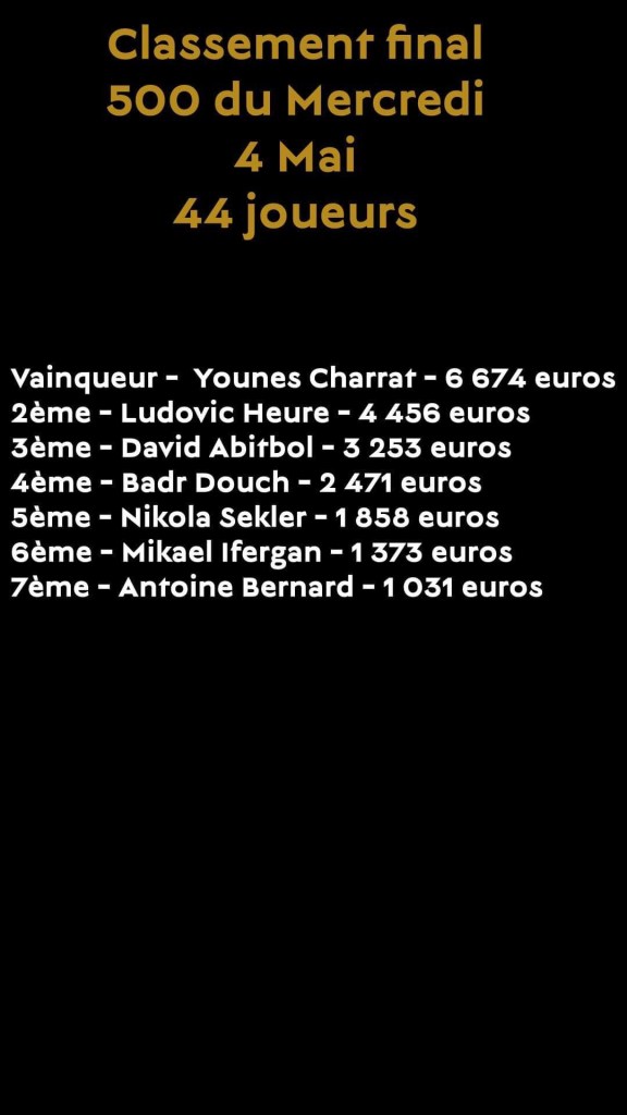 Comme tous les mercredis, le Club Barriere organisait son tournoi hebdomadaire à 560€. 44 entrants ont été comptabilisés. C’est Younès Charrat qui s’est imposé. Il empoche 6.674€. En Heads-up, il a dominé Ludovic Heure. David Abitbol complete le podium. 7 joueurs sont entrés dans l’argent.