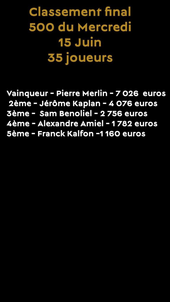 C’est Pierre Merlin, ex-pro PMU Poker, qui s’est adjugé le tournoi pour 7.026€. En Heads-up, il a dominé Jérôme Kaplan (4.076€). Sam Benoliel qui a brillé récemment sur le TexaPoker Festival au Club Montmartre complète le podium. 5 joueurs sont entrés dans l’argent : Alexandre Amiel, habitué du club et Franck Kalfon.