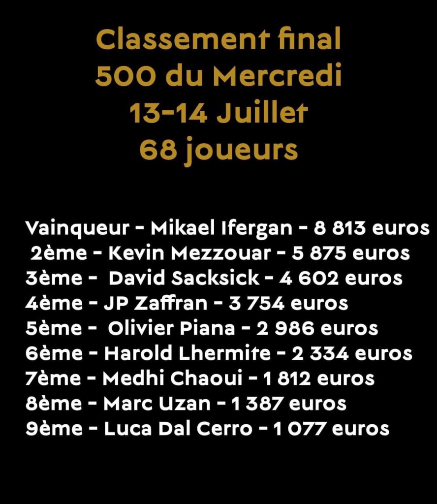 Comme chaque semaine, le Club Barriere organisait son fameux « 500 du Mercredi ». 68 joueurs étaient en lice et c’est Mikael Ifergan qui s’est imposé sur ce tournoi du 13 juillet pour 8.813 euros de gains.