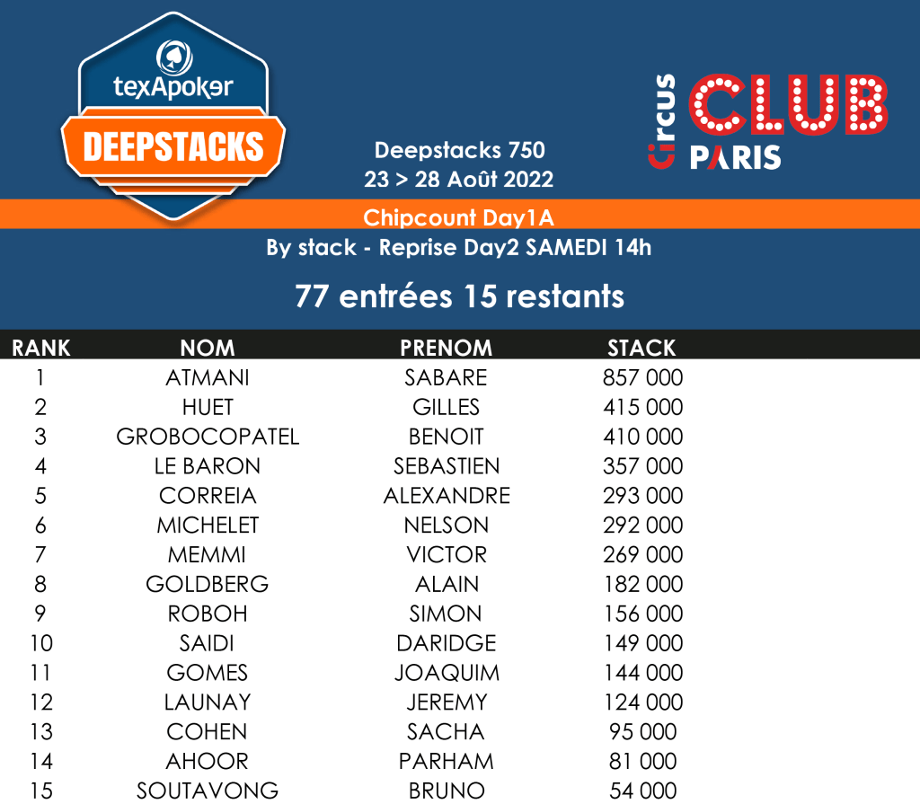A l’issue de ce Day 1A, on retrouve Sabare Atmani en position de chipleader avec un stack gigantesque (857.000 jetons). Le joueur a multiplié par 17 son stack de départ. Il entamera la suite de la compétition dans une position très confortable. Le joueur avait eu l’occasion de briller en juin dernier au Club Circus avec une victoire sur l’Open Circus.