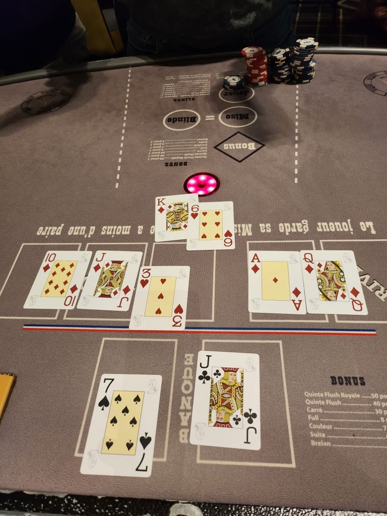 La nuit dernière, au Paris Elysées Club, rue Marbeuf, un joueur s’est installée à une table d’ultimate poker. Un peu plus tard, après avoir réalisé la mise annexe de 5€ et grâce à une quinte flush royale, il a décroché la cagnotte.