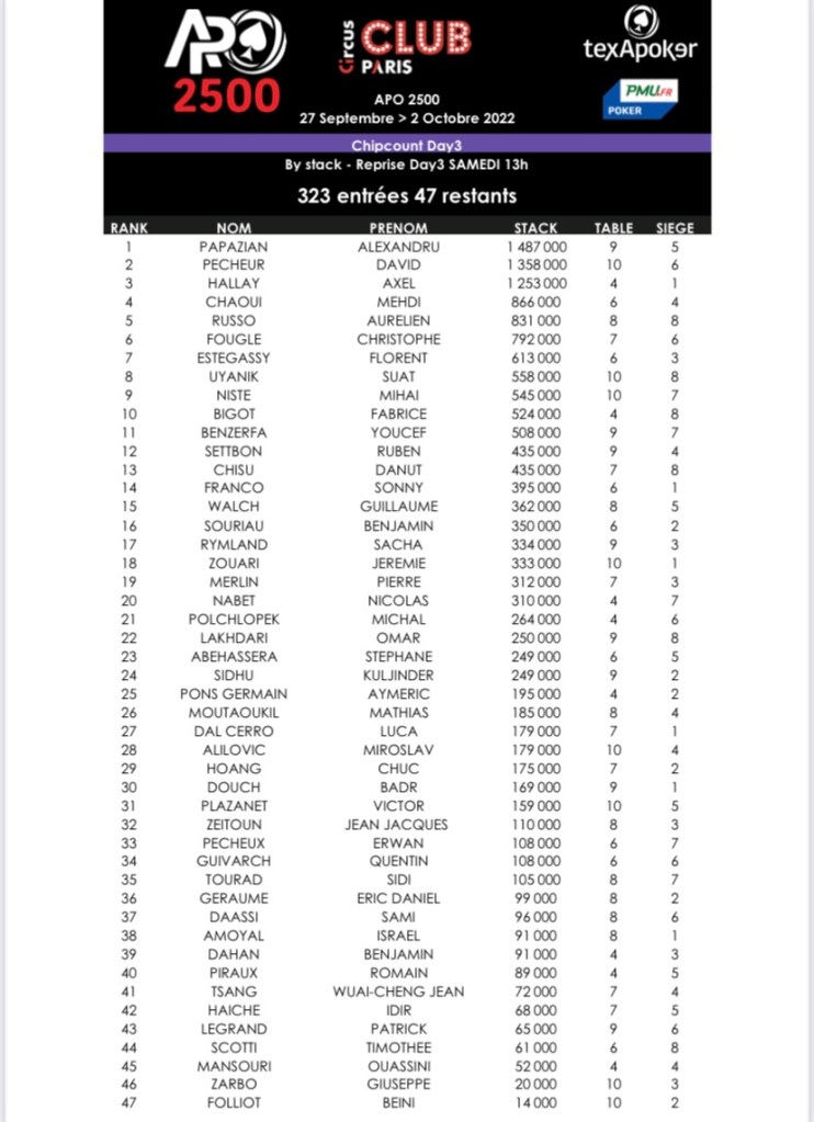 Ce samedi, ils ne sont plus de 47 survivants qui sont tous dans l’argent avec un min cash à 4.300€. Ils rêvent tous du titre et des 136.000€. C’est Alexandru Papazian qui mène les troupes, suivi de David Pecheur et David Hallay. Très bien placé également Mehdi Chaoui qui rêve du doublé (photo de Une).