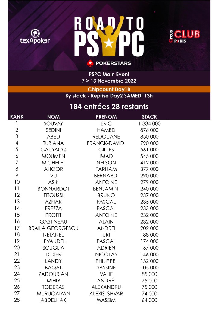 Mardi 8 novembre, au Club Circus, place au Day 1B du Road To PSPC by TexaPoker et PokerStars. Après les 158 entrants du Day 1A, 184 participants ont été recensés sur cette deuxième journées de départ. Ce qui porte le total provisoire à 342 entrants. 5 autres journées de départ sont prévues.