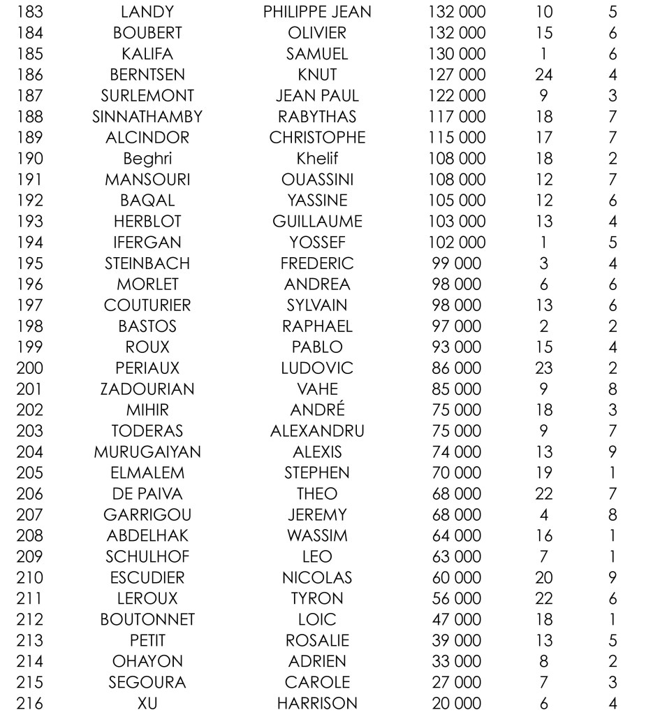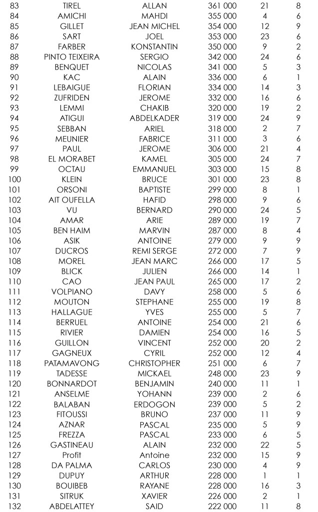 Le total de participants atteint donc 1441 unités. C’est tout simplement le record pour un club de jeux à Paris ! Sur le Day 1F, 40 entrants se sont qualifiés pour le Day 2. Sami Makhoul termine Chipleader de cette journée. Il est suivi de Marinel Oros et Mohamed Mokrani. Ça passe pour Rémy Biechel, David Sacksick ou encore Rosalie Petit !