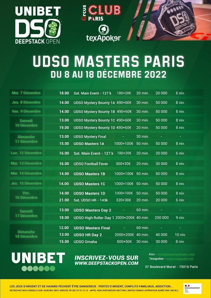 Un UDSO Mystery Bounty à 550€ viendra ouvrir le bal. Puis, 4 journées de départ sont prévues sur le Main Event à 1100€ ! Les joueurs partiront avec un tapis de départ de 50.000 jetons qu’il faudra faire fructifier sur des niveaux de 50 et 60 minutes. En parallèle, un High Roller 2200€ est programmé en clôture du festival (250.000 jetons sur des niveaux de 40 minutes).
