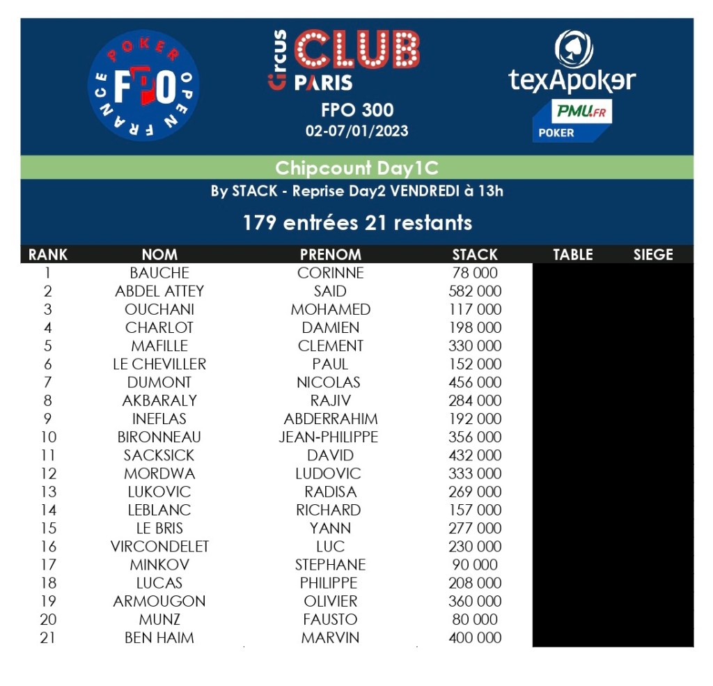 Parmi les qualifiés, Corine Bauché, Nicolas Dumont, David Sacksick, Marvin Dupré. A l’issue du Day 1C, c’est Said Abdel Attey qui a empaqueté le plus de jetons.