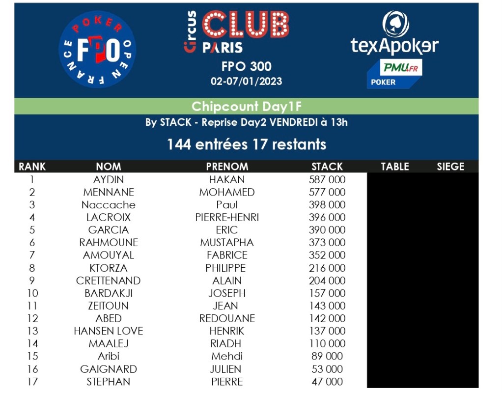 Sur l’ultime journée de départ, Hakan Aydin a empilé le plus de jetons (587.000), suivi dé Mohamed Mennane et Paul Naccache.