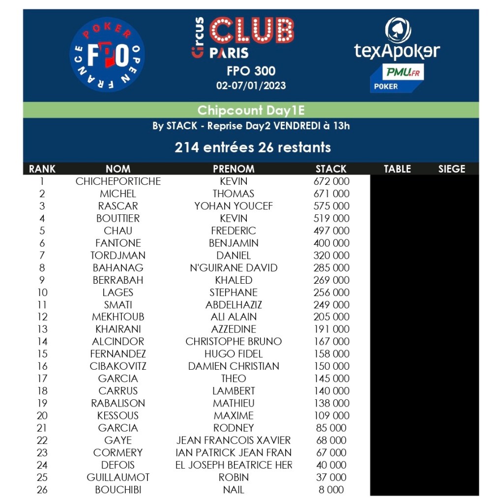 Sur le Day 1E, c’est Kevin Chicheportiche qui vire en tête avec 672.000 jetons. Puis, Thomas Michel et Yohan Rascar.