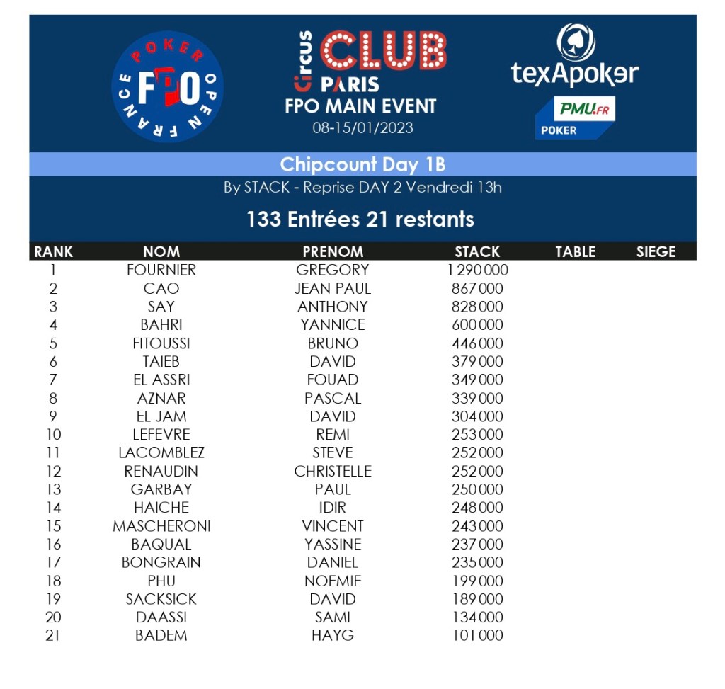 Le festival FPO by PMU Poker et TexaPoker se poursuit au Club Circus Paris. Hier, 133 entrants étaient sur la ligne de départ du Main Event à 600€. A l’issue de ce Day, 21 joueurs se sont qualifiés pour la suite de la compétition.