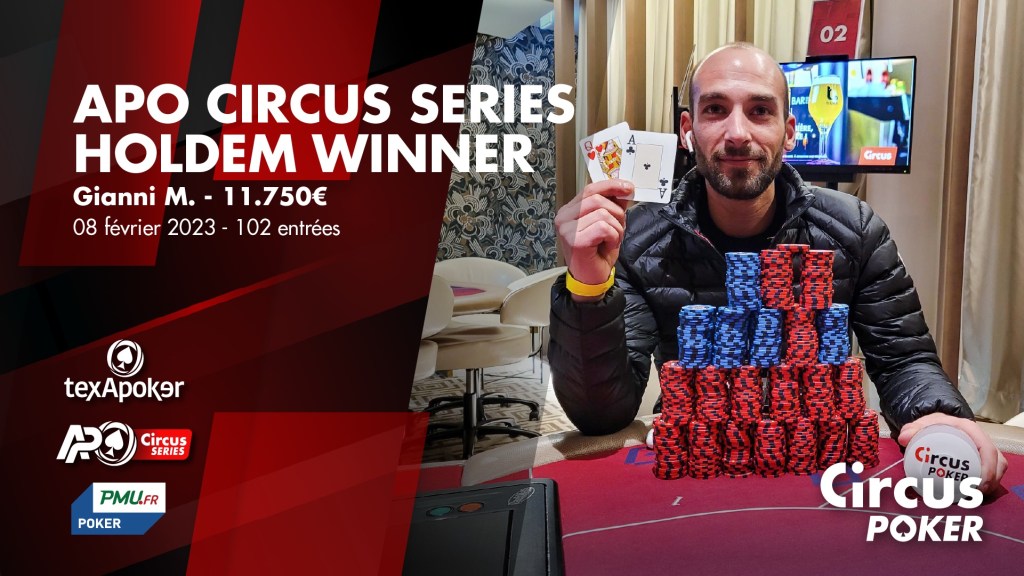 Tous les mercredis, le Club Circus Paris organise son traditionnel Apo Circus Series Hold’em à 500€ de Buy-in. Sur ce tournoi qui a enregistré 102 entrants (prizepool de 11.750€), c’est le joueur italien Gianni Magnante qui s’est imposé pour 11.750€.
