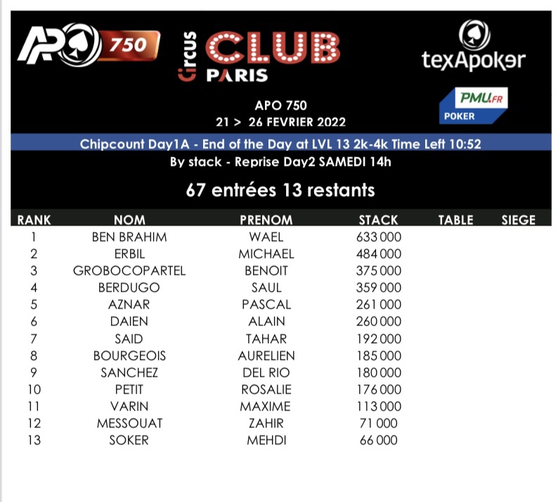 Le coup d’envoi de l’APO 750 a été donné hier au sein du club du 16e arrondissement avec le Day 1A. Quatre journées de départ sont prévues. 67 entrants ont été recensés sur ce tournoi à 750€. 13 joueurs se sont qualifiés pour la suite de la compétition.