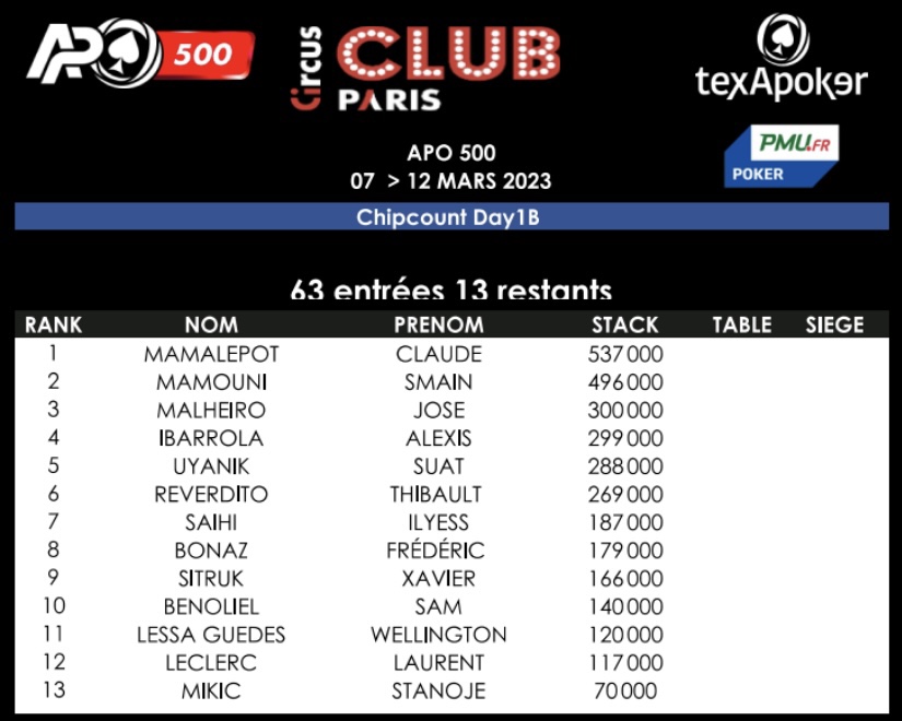 13 joueurs sont parvenus à se qualifier pour le Day 2 qui se déroulera samedi. C’est Claude Mamalepot qui termine avec le plus de jetons à l’issue de cette journée. Puis, on retrouve Smain Mamouni (496.000) et José Malheiro (300.000). Ça passe aussi pour Alexis Ibarrola qui avait récemment terminé 3e du Super High Roller du WPT Prime Paris. Thibault Reverdito décroche aussi son ticket. Aujourd’hui, place au Day 1C de la compétition.