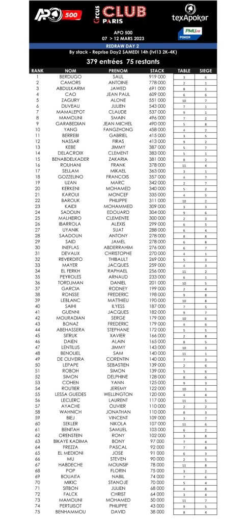 Les 75 joueurs qualifiés pour le Day 2 seront de retour ce samedi à partir de 13h au Club Circus Paris. C’est Saul Berdugo qui mène les troupes. A noter aussi qu’un APO 1000 débutera cet après-midi à 18h. Avis aux amateurs ! Un satellite à 170€ est prévu ce jour à 13h.