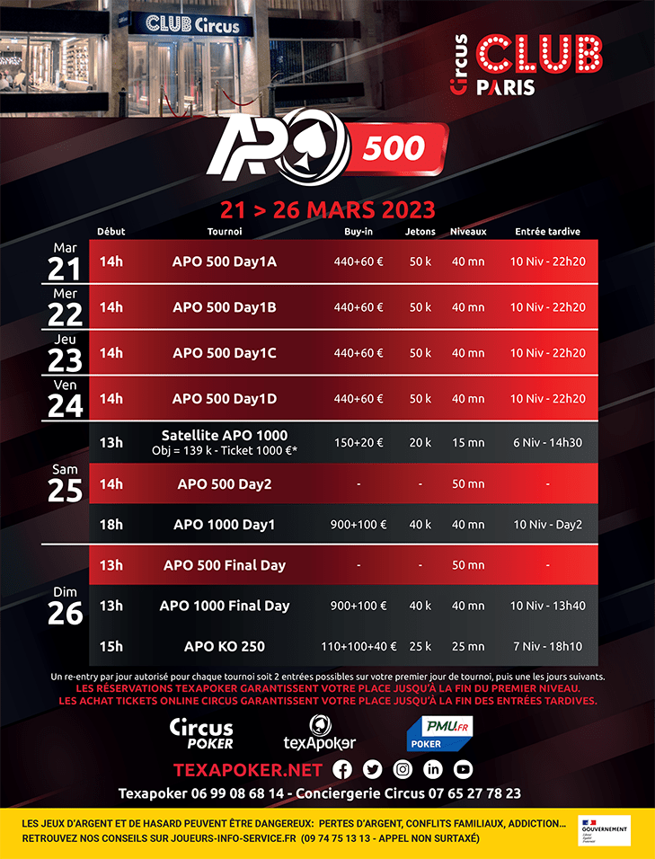 Le Club Circus est toujours très actif en matière de tournois. Du 21 au 26 mars, un festival de poker APO 500 vous attend avec le concours de Texapoker et PMU Poker ! Les amateurs de tournois vont se régaler.