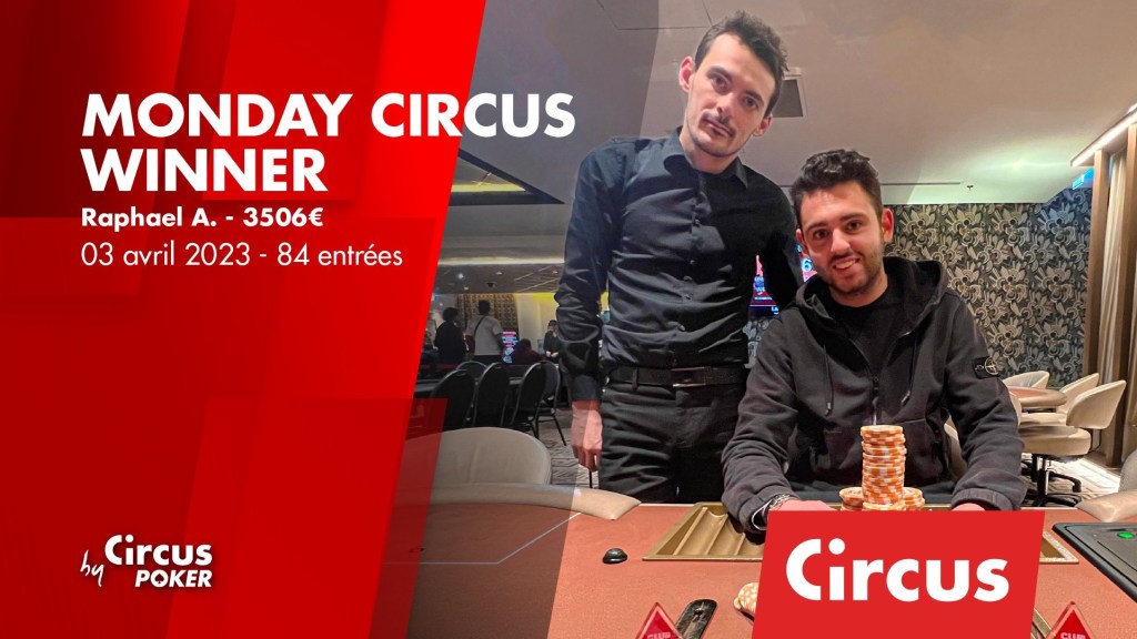 Comme tous les lundis, le Club Circus organisait son Monday Circus à 170€ de Buy-in. 84 entrants ont pris part à l’événement pour un prizepool de 12.096€ et c’est Raphael Azria qui a mis tout le monde d’accord et qui repart avec 3506€.